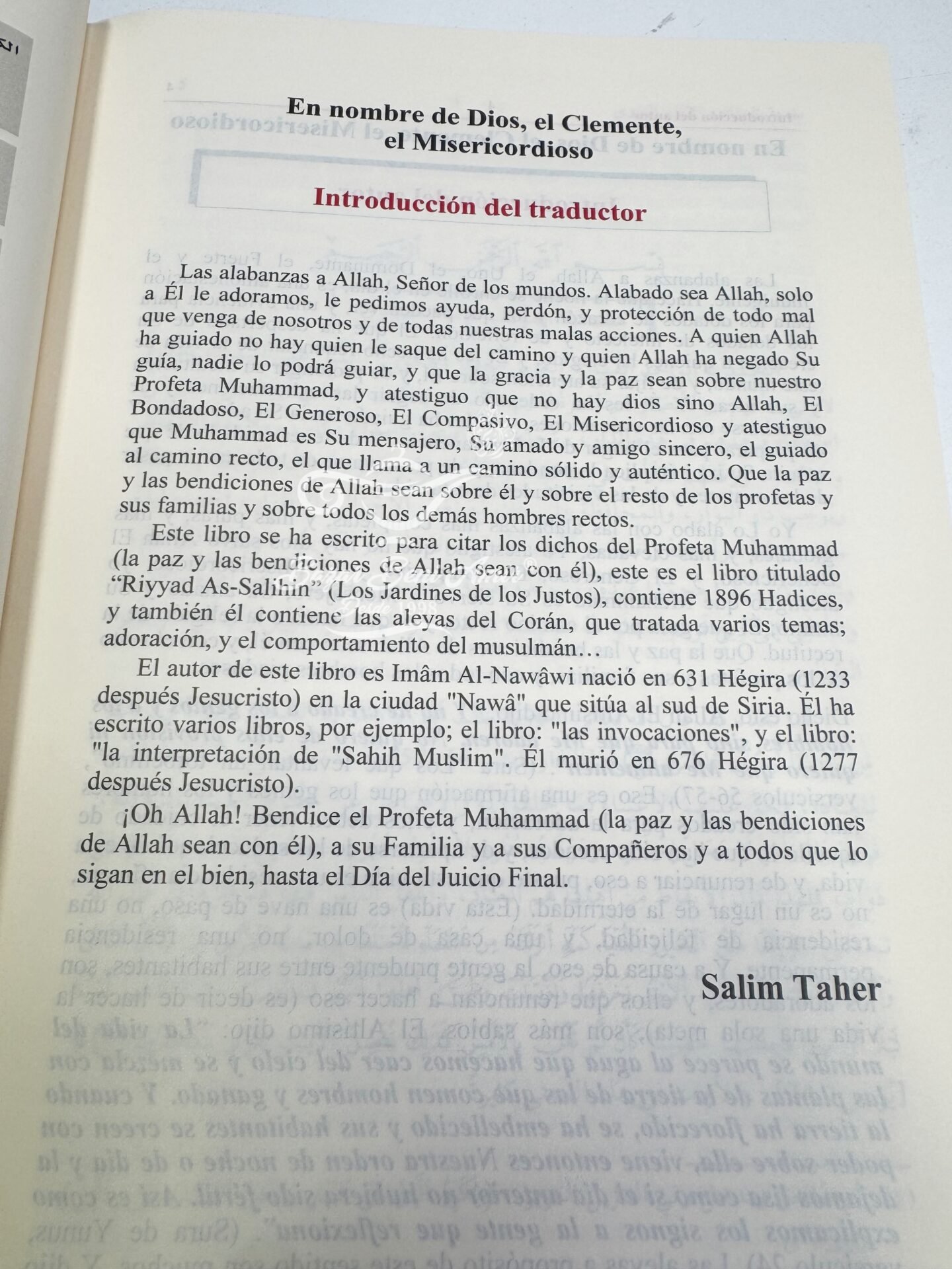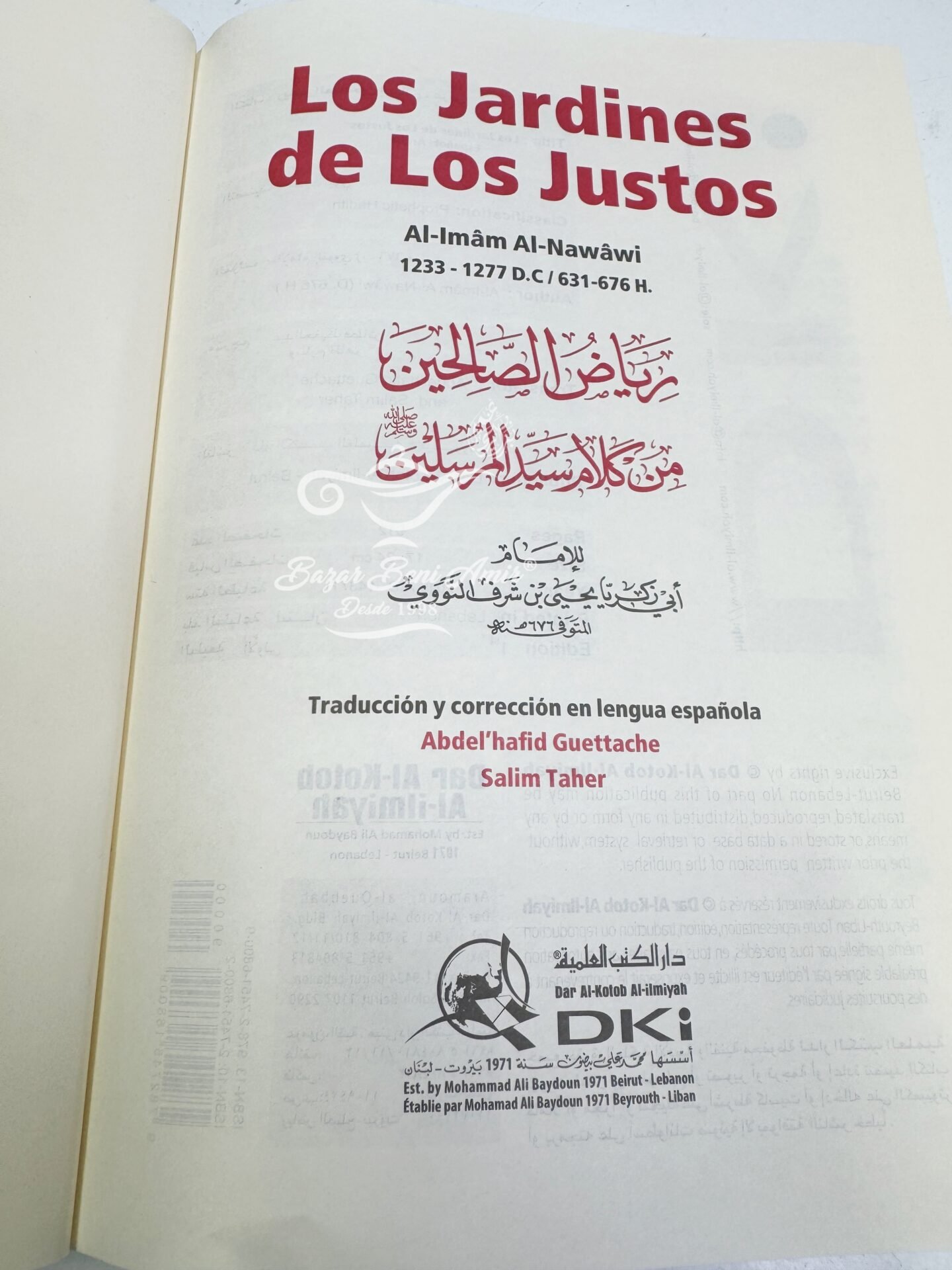 Este libro “Los Jardines de los Justos” por el Imâm Al-Nawâwi (nació en 631 H.a y murió en 676 H.) se ha escrito para citar los dichos del Profeta Muhammad (la paz y las bendiciones de Allah sean con él) y contiene 1896 Hadices, y también él contiene las aleyas del Corán, que tratada varios temas; adoración, y el comportamiento del musulmán…